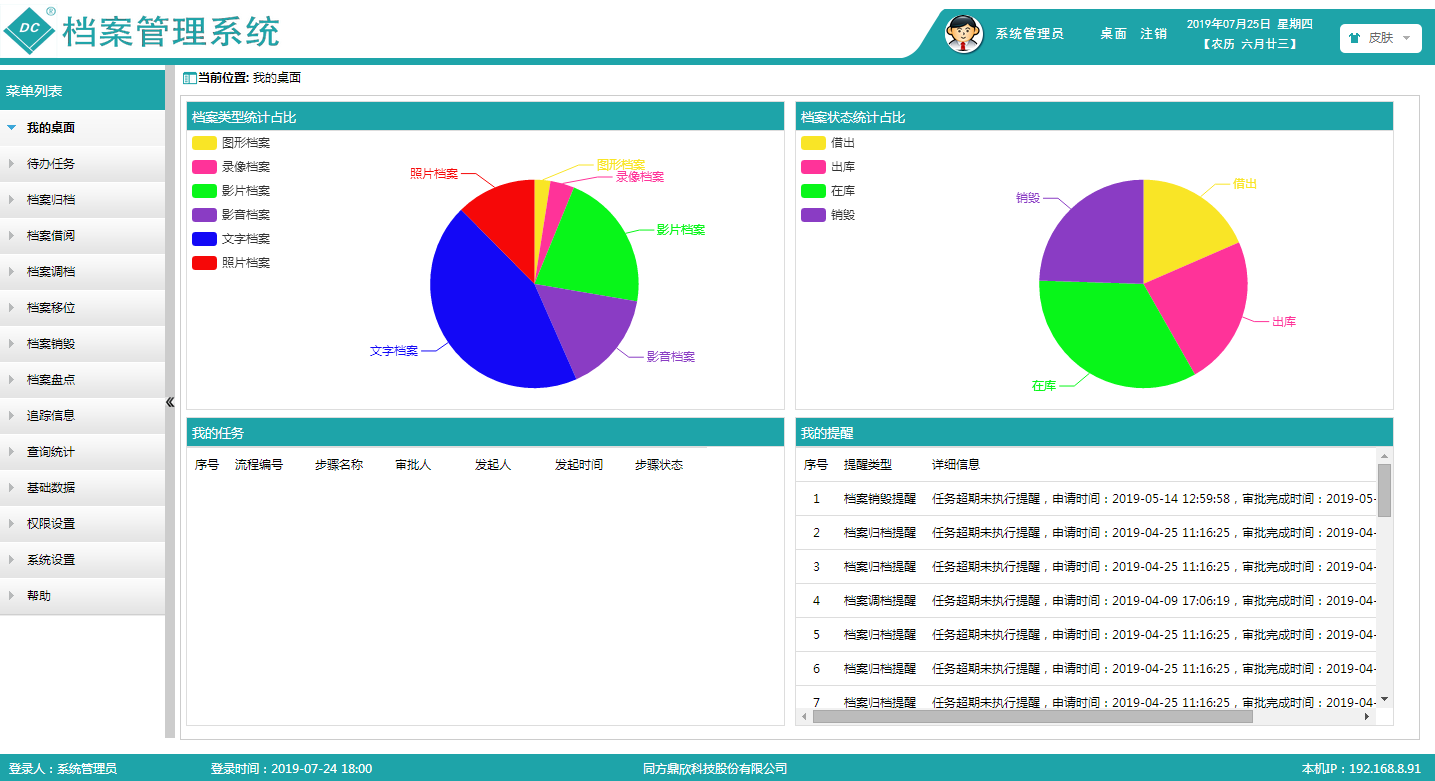 查询档案库存,审批、盘点、归档、借阅、调档、销毁、移位操作的记录,查询档案状态占比,档案性质占比。