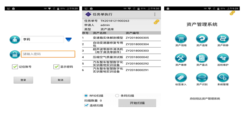 Ø 手持智能终端能够独立完成资产领用、盘点、归还、转移、维修保养、报废等操作。