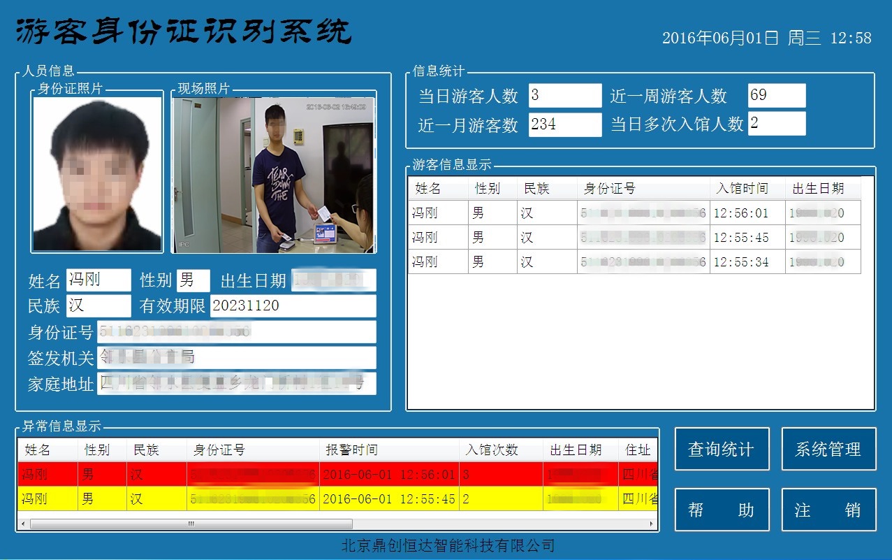 游客身份识别系统是北京鼎创恒达智能科技有限公司基于各大景区的需求,以人员身份有效证件为媒介,采用C/S模式开发的完整的自动出入场人员身份识别系统;通过本系统,在景区、博物馆出入口建立出了完整、安全、方便且具有信息化的游客实名参观登记体系,有效的管理游客的合理流动,有效防止盗用、套用身份信息的现象,合理的对进出的游客实行了有序的管理。