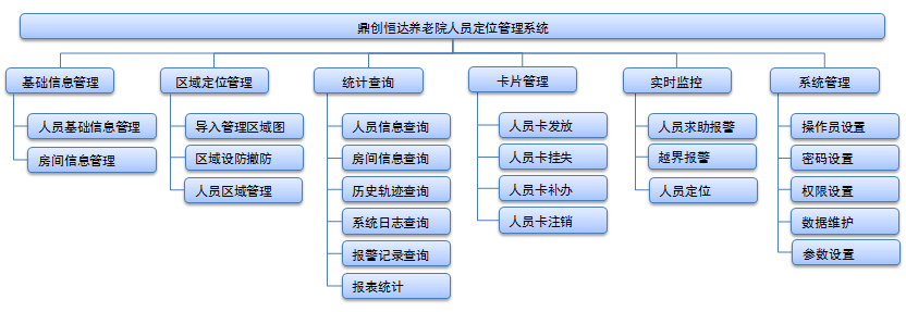 人员定位管理系统由基础数据管理部分、区域定位管理部分、统计查询部分、卡片管理、报警管理部分、系统管理部分组成,实现对老年公寓内人员的定位追踪,保障人身安全。