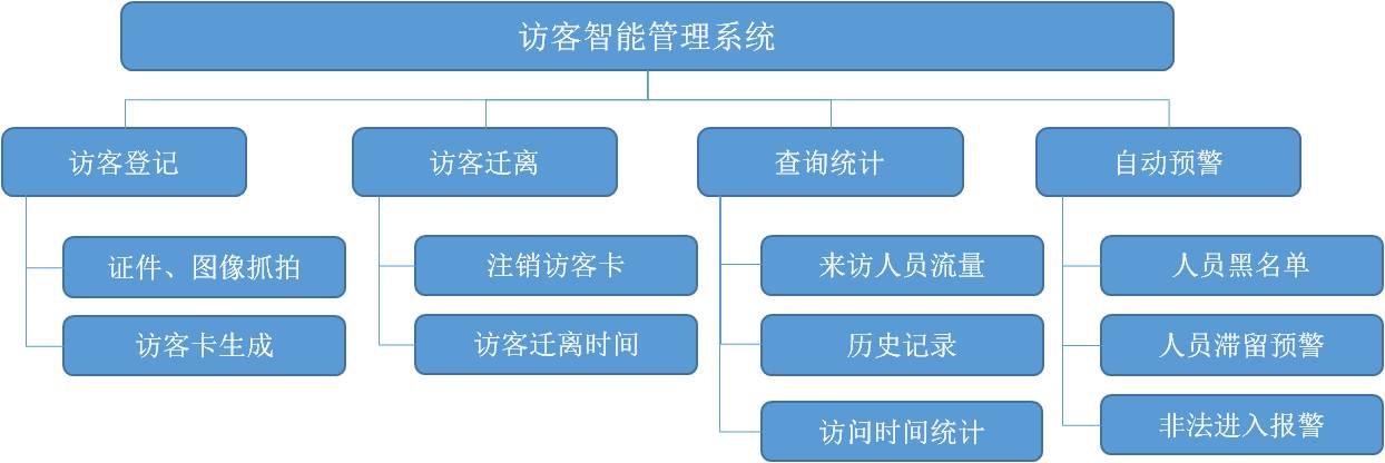 访客登记:来访人员通过访客智能管理系统登记有效证件后,系统自动进行证件/图像拍照,确认来访人员信息后,系统可适情况选择强屏通知被访者、电话通知被访者或确认进入三种处理方式,而后将访客信息提交系统,生成访客卡(RFID卡)/打印访客凭条后,来访人员以此卡进入访区。